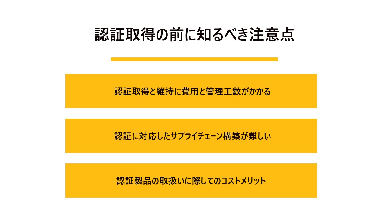 認証原料は通常の原料よりも高価であり、また、管理を分けるために最低生産ロットが大きくなる傾向があります。これにより、製品の原価や最小発注単位に影響が出る可能性があります。企画段階でコストシミュレーションを綿密に行い、販売価格や生産計画に反映させることが重要です。