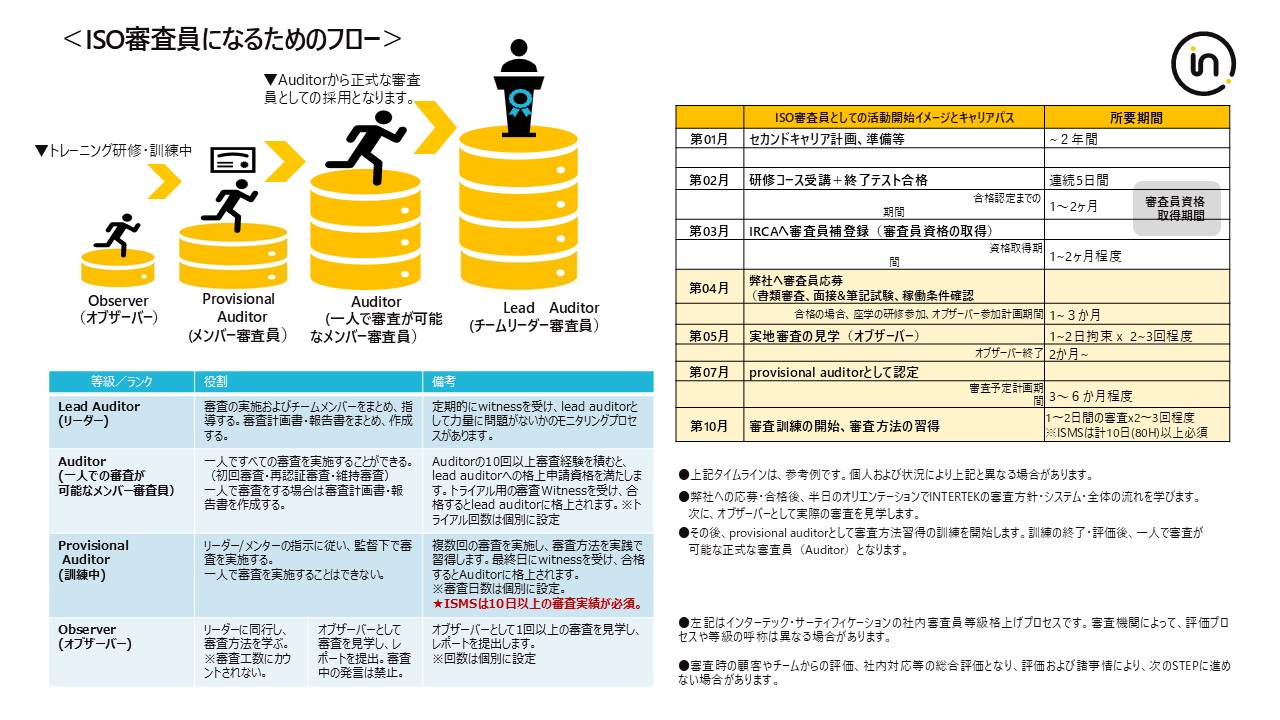 インターテック・サーティフィケーションの審査員昇格制度は、Observerから始まり、Provisional Auditor(訓練中)、Auditor(一単独での審査が可能)、Lead Auditor(審査チームのリーダー)の4つの等級/ランクで構成されます。